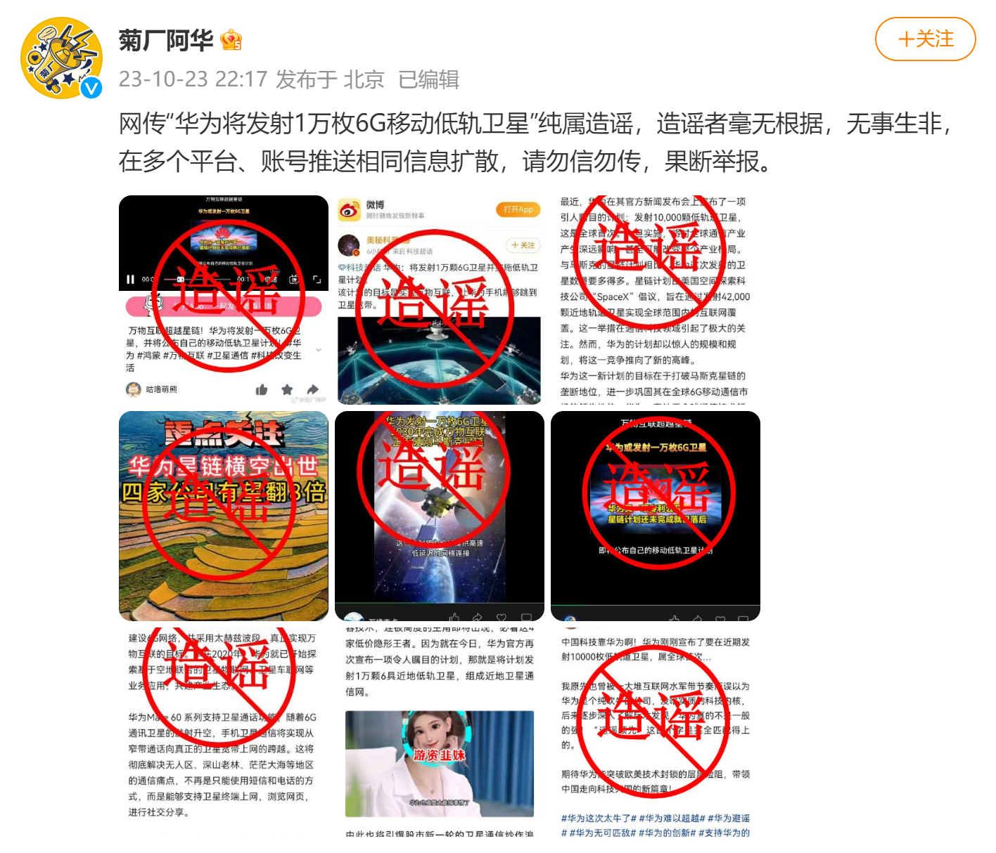 10月23日晚,華為技術(shù)有限公司官方微博“菊廠阿華”發(fā)布辟謠聲明: