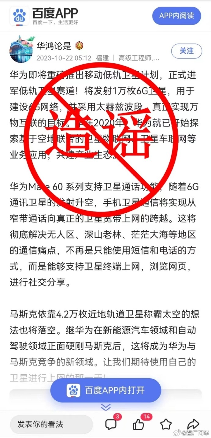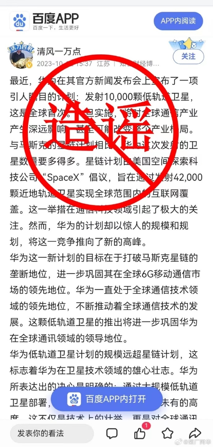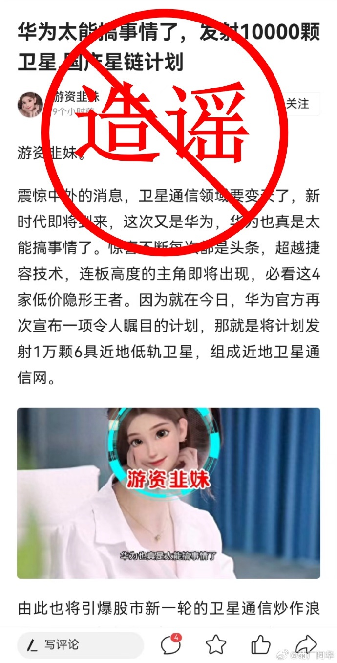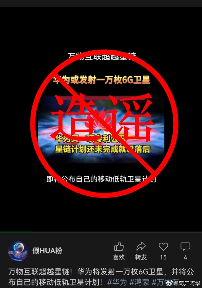 華為發(fā)布辟謠聲明:“華為將發(fā)射1萬枚6G移動(dòng)低軌衛(wèi)星”純屬造謠