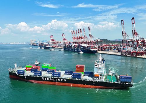 一艘貨輪緩緩駛離山東港口青島港(無(wú)人機(jī)照片,2023年8月30日攝)。新華社發(fā)(張進(jìn)剛 攝)