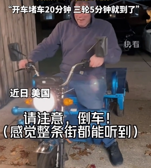 視頻中,國(guó)產(chǎn)“三蹦子”在國(guó)外街頭火了,美國(guó)公公收到中國(guó)兒媳送的“三蹦子”化身“顯眼包”,騎到大街上各處?kù)乓?/p>