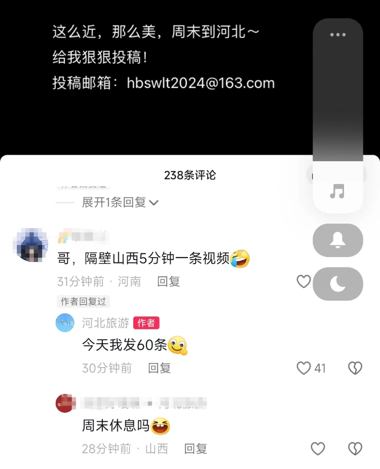 1月11日23點(diǎn)22分,河北省文化和旅游廳官方抖音號“河北旅游”更新,因?yàn)橛芯W(wǎng)友建議改名,不然都找不到,小編火速申請改名。在其最近一條公布投稿郵箱的更新中,有網(wǎng)友評論“哥,隔壁山西5分鐘一條視頻”。小編在評論中立下flag:今天我發(fā)60條。能否達(dá)到這個數(shù)字,可以拭目以待。
