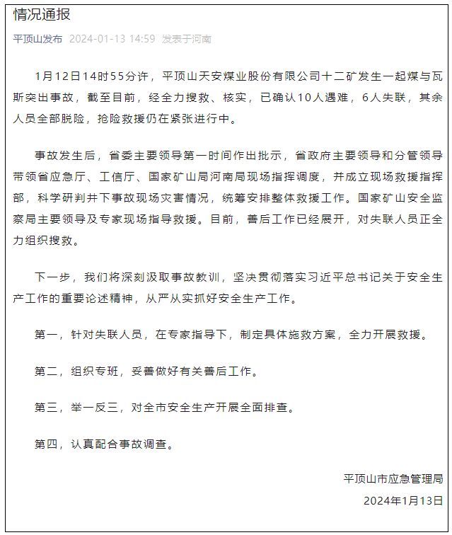 摘要:微信公眾號“平頂山發(fā)布”1月13日消息,1月12日14時55分許,平頂山天安煤業(yè)股份有限公司十二礦發(fā)生一起煤與瓦斯突出事故,截至目前,經全力搜救、核實,已確認10人遇難,6人失聯(lián),其余人員全部脫險,搶險救援仍在緊張進行中。