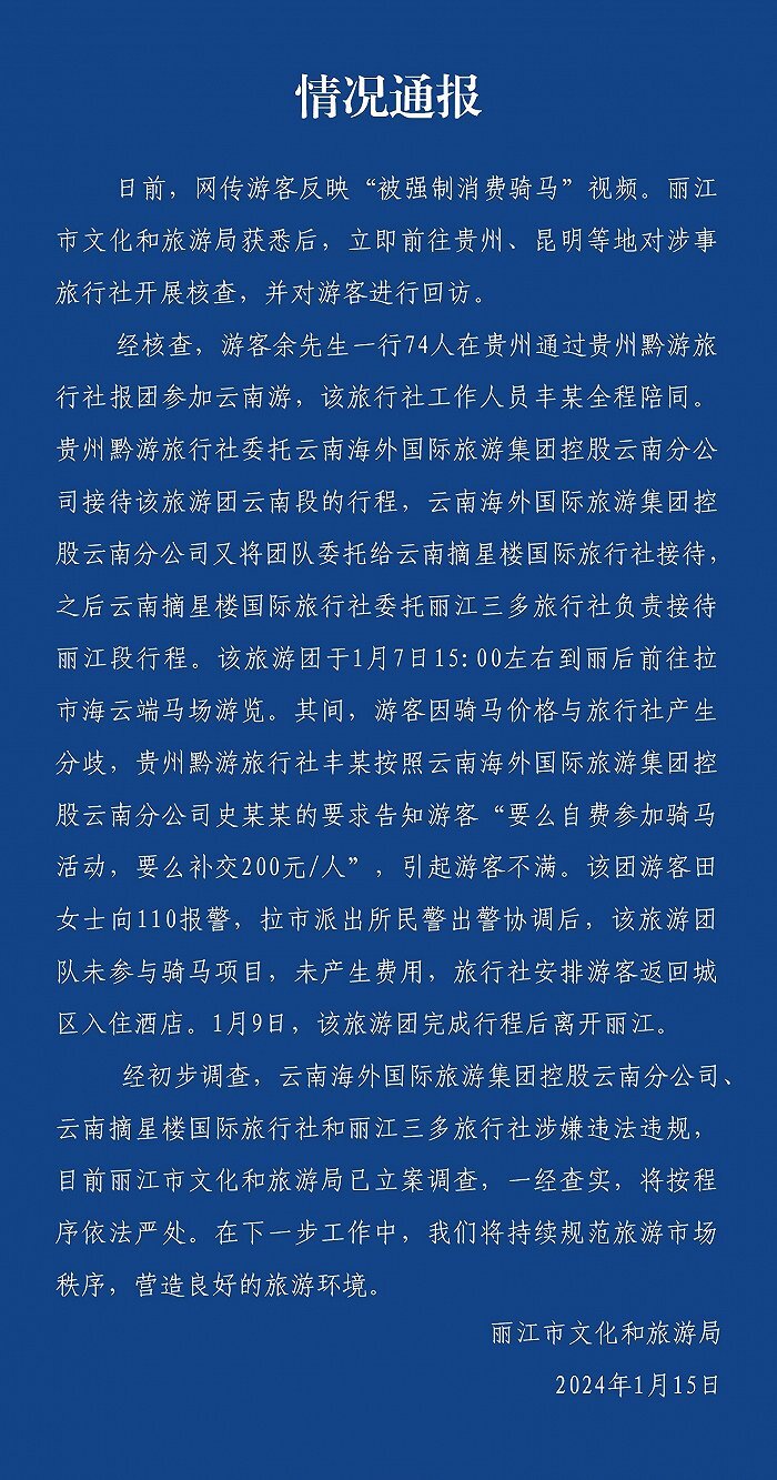 74人旅游團(tuán)游麗江被強(qiáng)制要求消費(fèi)騎馬?文旅局:三家旅游公司被立案調(diào)查