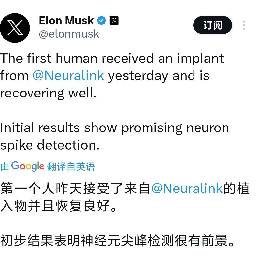 北京時間1月30日,馬斯克在社交平臺X宣布,昨天首例人類接受了腦機接口公司Neuralink的植入物,目前恢復良好。初步結果顯示神經元尖峰檢測(neuron spike detection)表現出良好的前景。