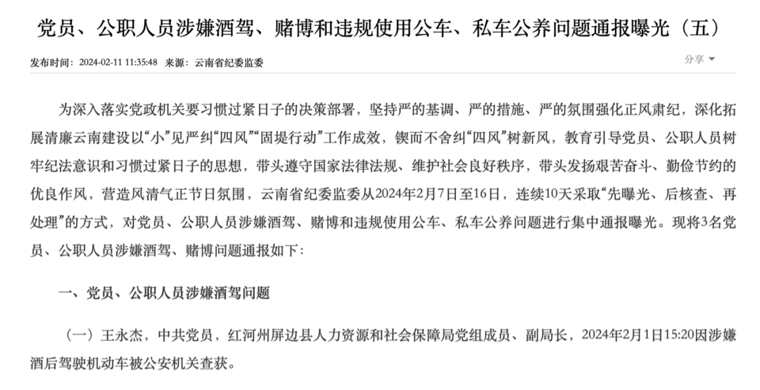 2月5日,云南省紀(jì)委監(jiān)委發(fā)布了《關(guān)于集中通報(bào)曝光黨員、公職人員酒駕、賭博及背后“四風(fēng)”問(wèn)題和違規(guī)使用公車、私車公養(yǎng)問(wèn)題的公告》。