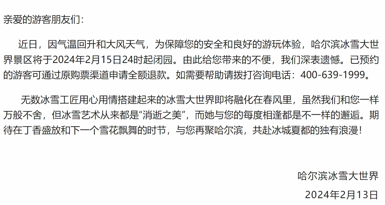 近日,因氣溫回升和大風(fēng)天氣,為保障您的安全和良好的游玩體驗(yàn),哈爾濱冰雪大世界景區(qū)將于2024年2月15日24時(shí)起閉園。由此給您帶來(lái)的不便,我們深表遺憾。已預(yù)約的游客可通過(guò)原購(gòu)票渠道申請(qǐng)全額退款。如需要幫助請(qǐng)撥打咨詢電話:400-639-1999。