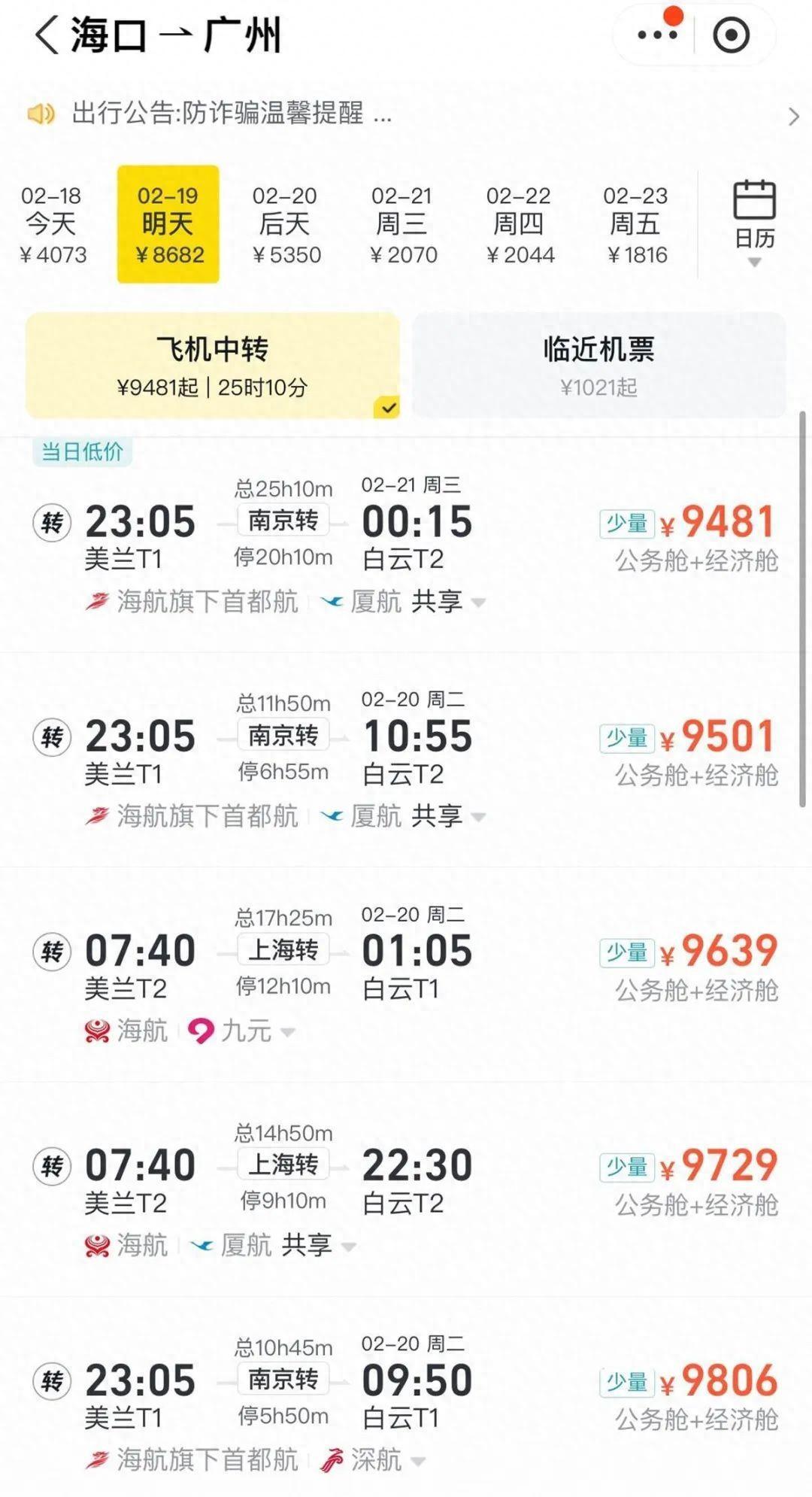 近日,海南游客離島機(jī)票價格上漲、出島難問題引發(fā)關(guān)注。記者搜索多個平臺發(fā)現(xiàn),春節(jié)假期結(jié)束后兩日,從海南三亞、海南海口至廣州、北京等地的機(jī)票價格飆升至5000元以上,部分航班機(jī)票價格突破萬元。