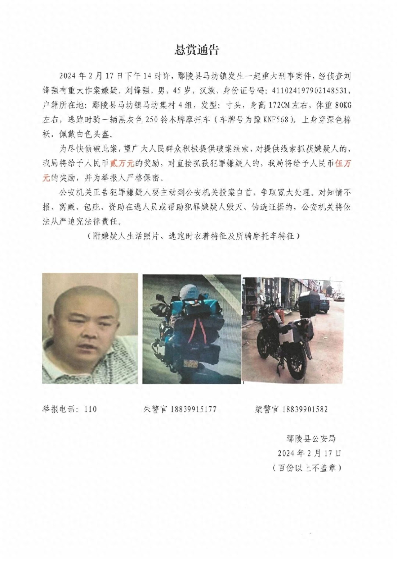 此前,鄢陵縣公安局發(fā)布懸賞通告:2024年2月17日下午14時許,鄢陵縣馬坊鎮(zhèn)發(fā)生一起重大刑事案件,經(jīng)偵查劉鋒強有重大作案嫌疑。劉鋒強,男,45歲,漢族,身份證號碼:411024197902148531,戶籍所在地:鄢陵縣馬坊鎮(zhèn)馬坊集村4組,寸頭,身高172CM左右,體重80KG左右,逃跑時騎一輛黑灰色250鈴木牌摩托車(車牌號為豫KNF568),上身穿深色棉襖,佩戴白色頭盔。
