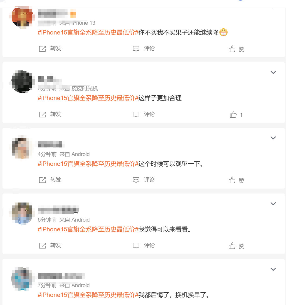 針對該話題,有網(wǎng)友評論「你不買我不買果子還能繼續(xù)降」「我都后悔了,換機換早了」。