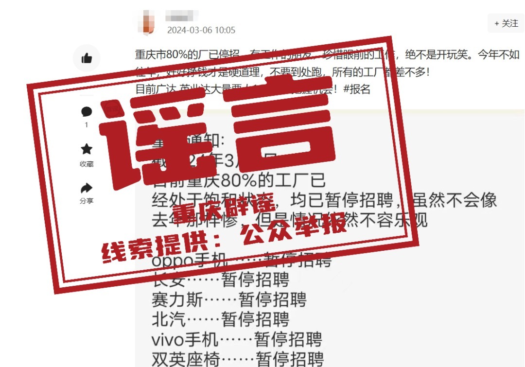 摘要:近日,有網(wǎng)民在某網(wǎng)絡(luò)平臺(tái)上發(fā)布信息:“目前重慶市80%的廠已處于飽和狀態(tài),均已暫停招聘”,引發(fā)社會(huì)關(guān)注。經(jīng)相關(guān)部門核實(shí),網(wǎng)傳信息為謠言。