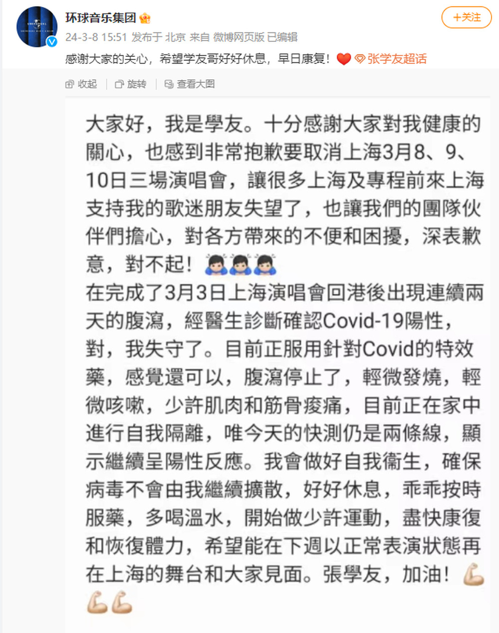 3月8日下午,張學友通過@環(huán)球音樂集團 發(fā)布近況。張學友在文中稱,在完成了3月3日上海演唱會回港后出現(xiàn)連續(xù)兩天的腹瀉,經(jīng)醫(yī)生診斷確認Covid-19陽性。“對,我失守了。”