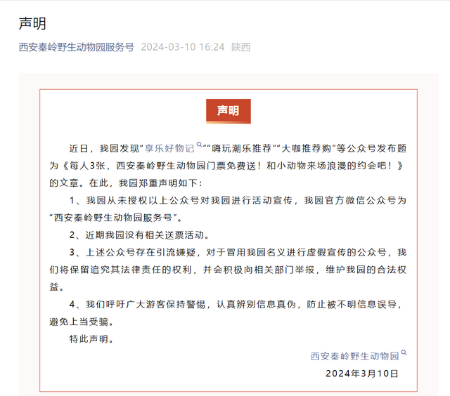 摘要:近日,我園發(fā)現(xiàn)“享樂好物記”“嗨玩潮樂推薦”“大咖推薦購”等公眾號發(fā)布題為《每人3張,西安秦嶺野生動物園門票免費送!和小動物來場浪漫的約會吧!》的文章。在此,我園鄭重聲明如下: