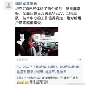 坦克700 Hi4-T上市前,2月23日,坦克品牌執(zhí)行副總經(jīng)理谷玉坤在社交媒體上發(fā)出了魏建軍的朋友圈截圖稱,“魏總難得發(fā)朋友圈,坦克團(tuán)隊(duì)獲得了表揚(yáng),其實(shí)何止圖上這一次,每周的評審,魏總現(xiàn)場都查得太細(xì)致了,每一個(gè)改進(jìn)點(diǎn)都要落實(shí)到位。”