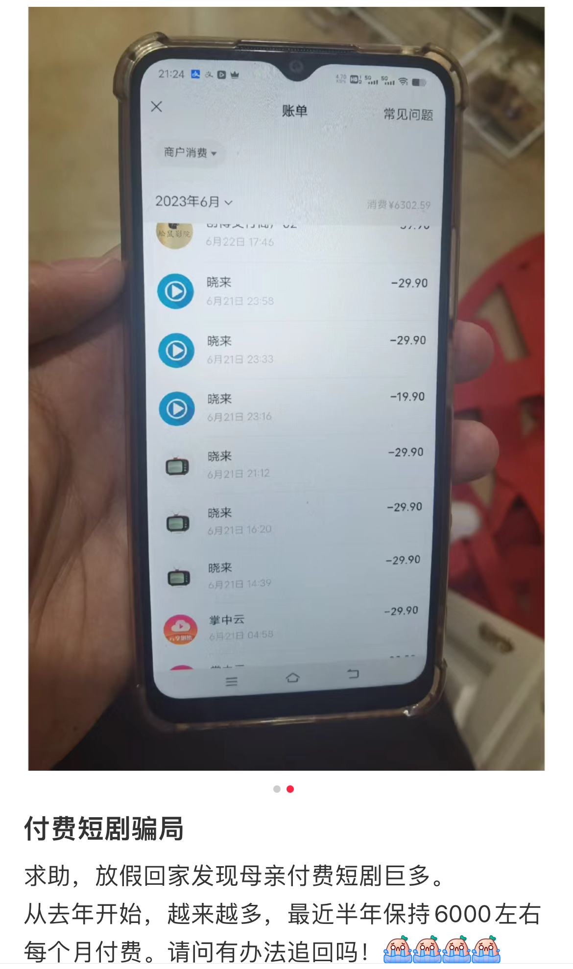“放假回家發(fā)現(xiàn)媽媽為微短劇付費(fèi)越來(lái)越多,最近半年保持著6000元/月的付費(fèi)頻率”。近日,有消費(fèi)者向紅星資本局爆料稱,當(dāng)下大火的微短劇存在誘導(dǎo)付費(fèi)、收費(fèi)金額高和重復(fù)收費(fèi)等亂象。其家人為了追劇瘋狂“氪金”,陸陸續(xù)續(xù)充值了4萬(wàn)元。