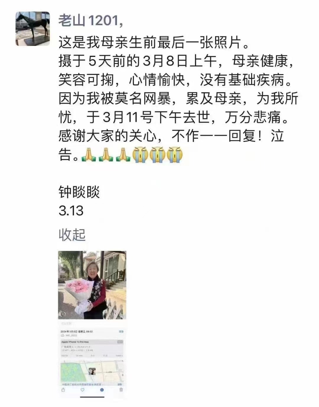 3月13日,鐘睒睒在朋友圈更新了一條信息,其中附有一張其母拍攝于3月8日的照片,并表示“母親健康,笑容可掬,心情愉快,沒有基礎(chǔ)疾病”。但“因為我被莫名網(wǎng)暴,累及母親,為我所憂,于3月11號下午去世,萬分悲痛”。