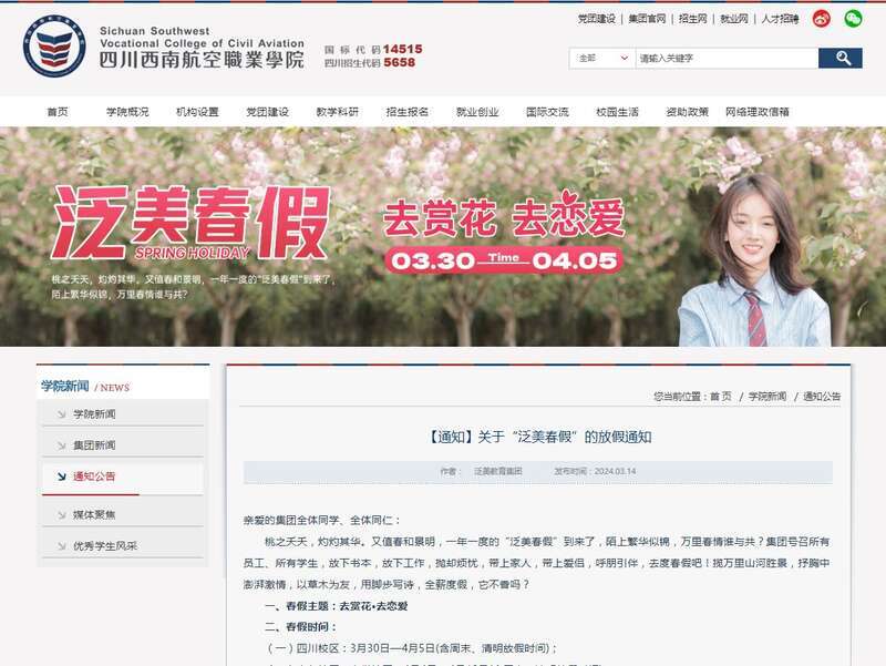 四川西南航空職業(yè)學院放春假通知。學校官網截圖