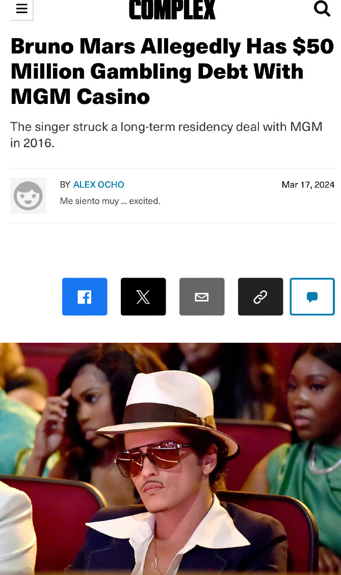 這次火星哥欠下巨額賭債的消息引發(fā)網(wǎng)絡(luò)熱議。雖然火星哥有著穩(wěn)定的票房號(hào)召力,甚至有傳言稱(chēng)他每年的駐唱能賺取高達(dá)9000萬(wàn)美元的收入,但扣除稅務(wù)后(大致4500萬(wàn)美元),這些收入似乎仍不足以填補(bǔ)他所欠下的巨額債務(wù)。
