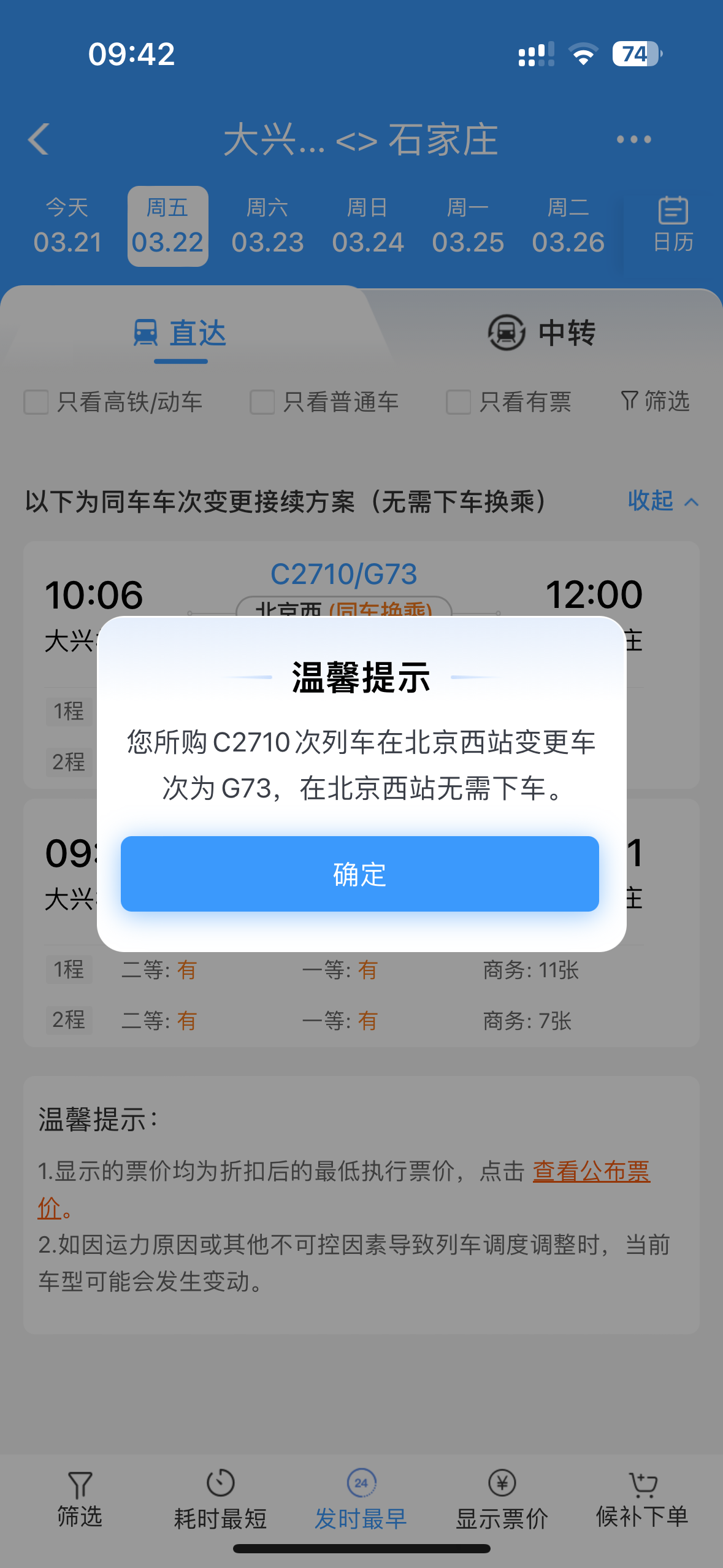 例如記者在12306客戶端內(nèi)搜索,3月21日,從大興機場站到石家莊站,這一乘車區(qū)間此前并沒有直達列車,有出行需求的旅客只能選擇在北京西站中轉(zhuǎn)其他列車的換乘方式。而增加了“同車換乘”功能后,12306客戶端則提供了兩種“直達”方案,分別為G2712次/G337次的9時16分出發(fā)、11時41分到達,以及G2710次/G73次10時6分出發(fā)、12時到達,耗時分別為2小時25分與1小時54分。根據(jù)系統(tǒng)提示,旅客這一次行程雖然乘坐的列車分為兩個車次號,但只是同一列車在北京西站進行車次號變更,旅客無需下車。