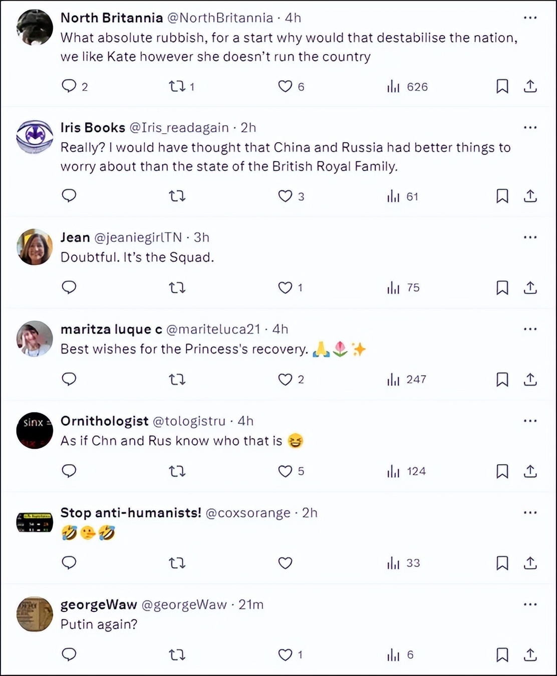 在這篇報(bào)道中,作者僅援引過(guò)往報(bào)道及消息人士的話稱,中國(guó)、俄羅斯等國(guó)家此前曾對(duì)英國(guó)發(fā)起網(wǎng)絡(luò)攻擊。隨后文章表示,近日在各大社交媒體平臺(tái),關(guān)于“凱特消失”的內(nèi)容獲得了極大的流量,隨后消息人士稱這種現(xiàn)象是由于“中俄網(wǎng)軍在推波助瀾”。
