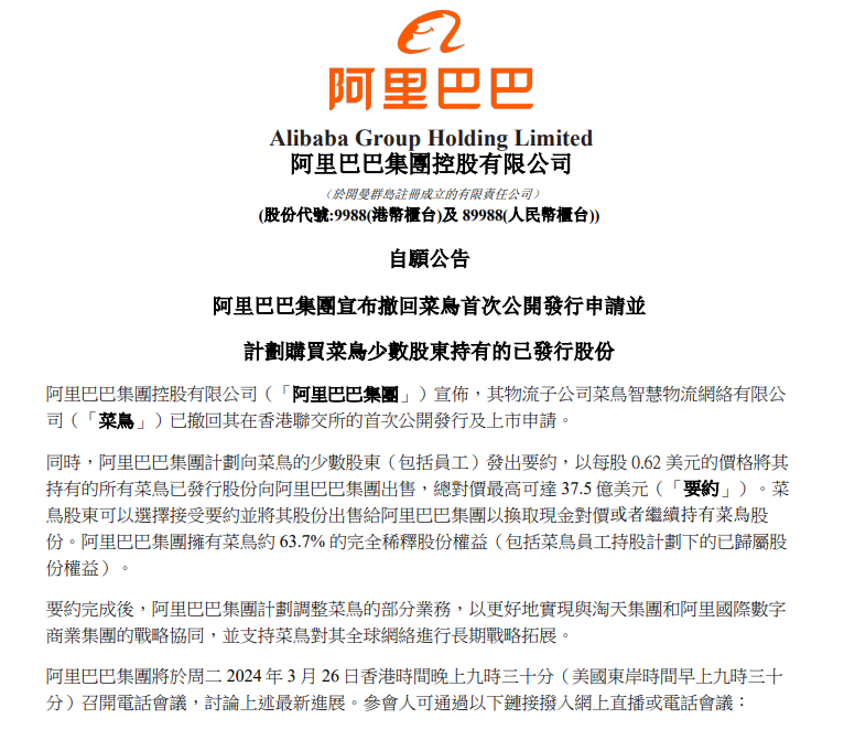 摘要:阿里巴巴集團(tuán)3月26日公告,為更好加強(qiáng)與阿里電商業(yè)務(wù)協(xié)同,以及繼續(xù)支持菜鳥擴(kuò)大全球物流網(wǎng)絡(luò)投入,決定撤回菜鳥上市申請(qǐng),并以現(xiàn)金要約收購(gòu)菜鳥少數(shù)股東的所有股權(quán)和員工已歸屬的股權(quán)。本次收購(gòu)涉及金額達(dá)到37.5億美元(約270.69億元人民幣)。這一策略凸顯了阿里加強(qiáng)其電商核心業(yè)務(wù)和物流協(xié)同的聚焦,以及對(duì)未來(lái)物流戰(zhàn)略投入的信心。