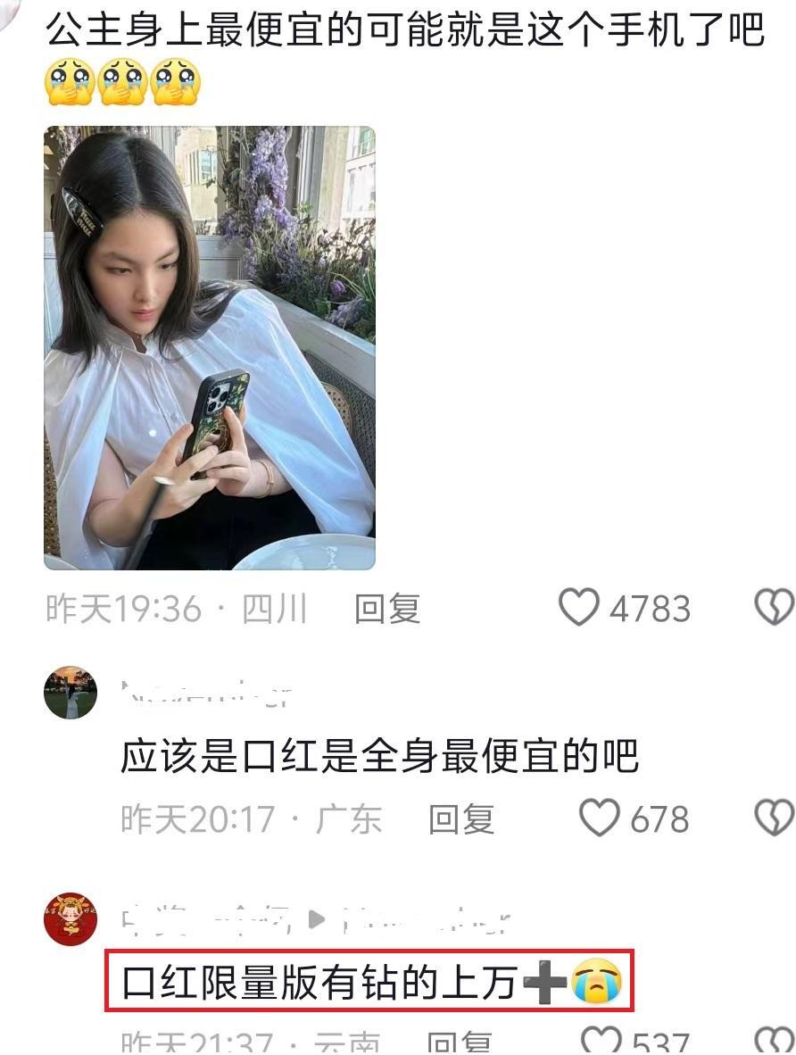 但可惜的是,這部分網(wǎng)友并沒有自己安慰到自己,因?yàn)槌耸謾C(jī)確實(shí)沒有那么夸張的價格外,口紅和手機(jī)殼也都是普通人觸及不到的產(chǎn)品,前者被曝是價格上萬的某品牌有鉆的限量版,后者也是知名品牌,價格500+。