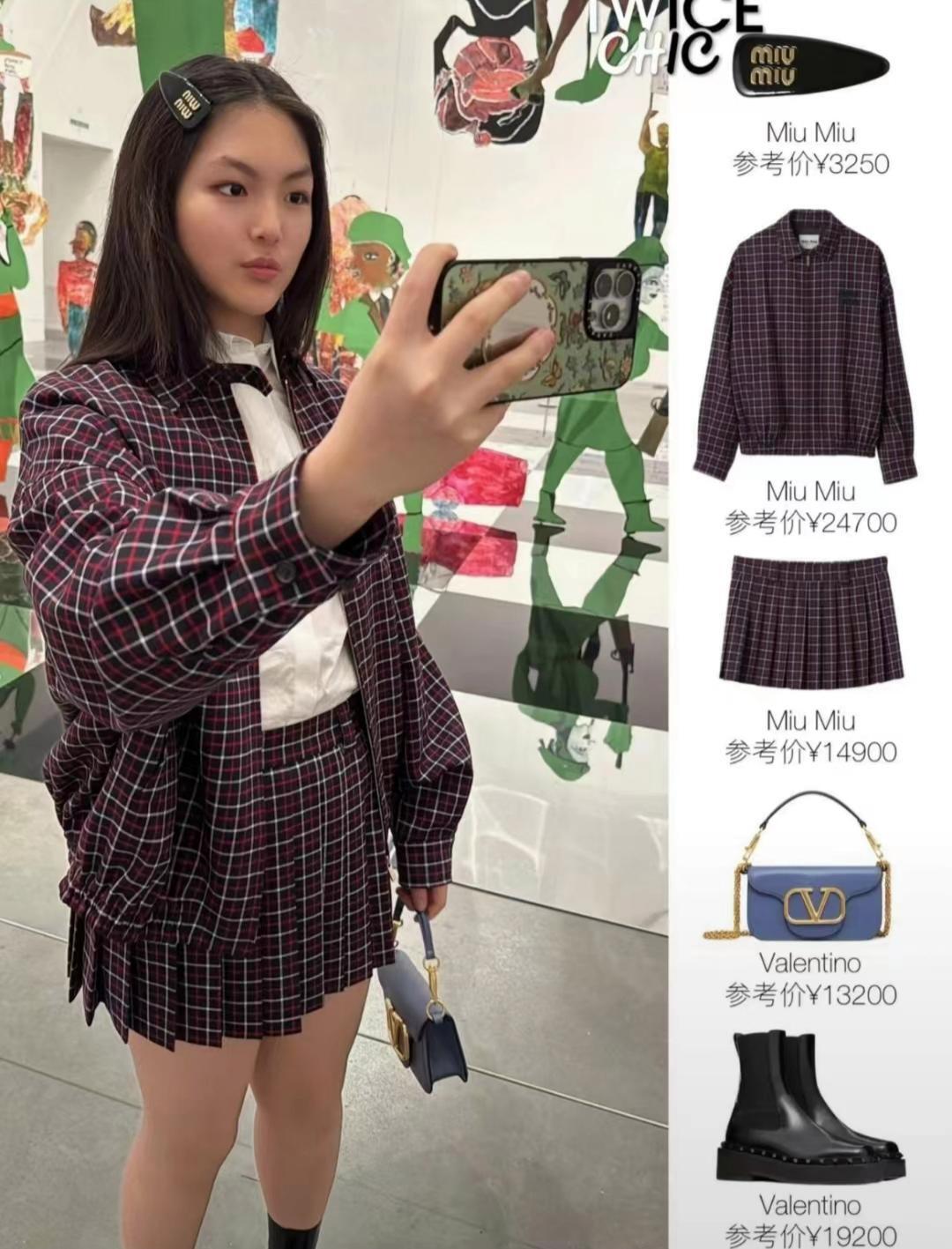王詩齡穿的上衣價格是24700元,短裙是14900元,單單是這套紫色格紋套裝就價值近4萬,是很多四五線城市普通打工族一年的工資。