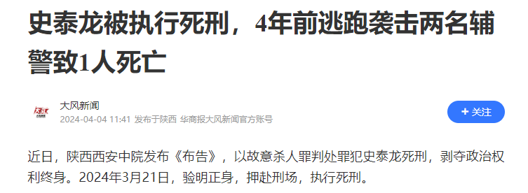 據(jù)華商報(bào)大風(fēng)新聞4月4日?qǐng)?bào)道,近日,陜西西安中院發(fā)布《布告》,以故意殺人罪判處罪犯史泰龍死刑,剝奪政治權(quán)利終身。2024年3月21日,驗(yàn)明正身,押赴刑場(chǎng),執(zhí)行死刑。