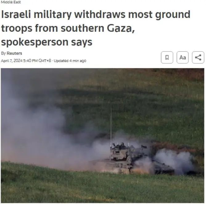 據(jù)路透社消息,當(dāng)?shù)貢r間4月7日,以色列軍方發(fā)言人表示,以軍已從加沙地帶南部撤出幾乎所有地面部隊,僅留下一個旅的人員。