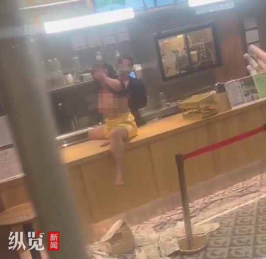 網(wǎng)傳視頻畫面中,一位女子身穿深色上衣和黃色短褲赤足坐在奶茶店柜臺上,上身幾乎赤裸,情緒十分激動。店內(nèi)一名店員站在柜臺后面拉著女子的胳膊,地面上散落著許多奶茶包裝袋。奶茶店門外還聚集了幾位外賣騎手和圍觀者。