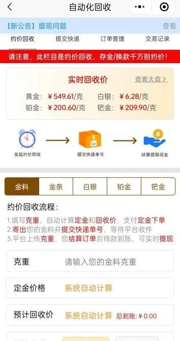 在線下黃金回收火熱的同時,線上黃金回收業(yè)務(wù)也吸引了不少持金者。中新財經(jīng)注意到,目前不少平臺開展線上黃金業(yè)務(wù),一些貴金屬回收商也開設(shè)了公眾號、小程序、APP等線上回收平臺。