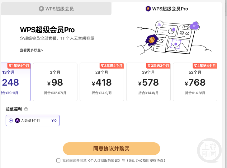 “WPS超級(jí)會(huì)員Pro”買1年贈(zèng)送AI會(huì)員1個(gè)月。軟件截圖