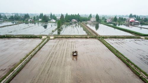 2024年4月10日,一臺(tái)無(wú)人駕駛水稻插秧機(jī)在湖南省益陽(yáng)市大通湖區(qū)再生稻無(wú)人農(nóng)場(chǎng)作業(yè)(無(wú)人機(jī)照片)。新華社記者 陳振海 攝