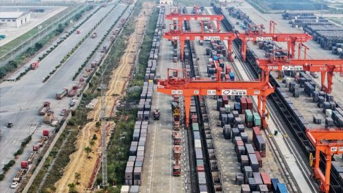在廣西欽州鐵路集裝箱中心站,貨車在排隊(duì)轉(zhuǎn)運(yùn)集裝箱(2024年3月28日攝,無(wú)人機(jī)照片)。新華社記者 張愛林 攝