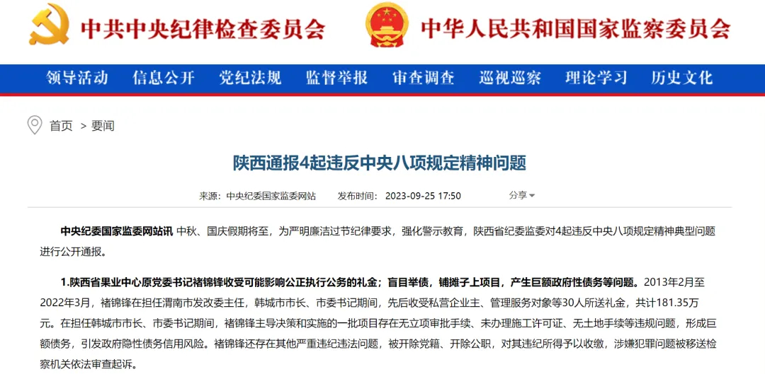 去年9月25日,中央紀(jì)委國家監(jiān)委網(wǎng)站首次披露稱,在擔(dān)任韓城市市長、市委書記期間,褚錦鋒主導(dǎo)決策和實(shí)施的一批項(xiàng)目存在無立項(xiàng)審批手續(xù)、未辦理施工許可證、無土地手續(xù)等違規(guī)問題,形成巨額債務(wù),引發(fā)政府隱性債務(wù)信用風(fēng)險(xiǎn)。