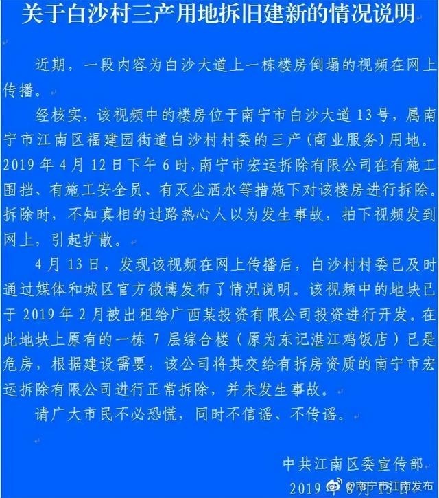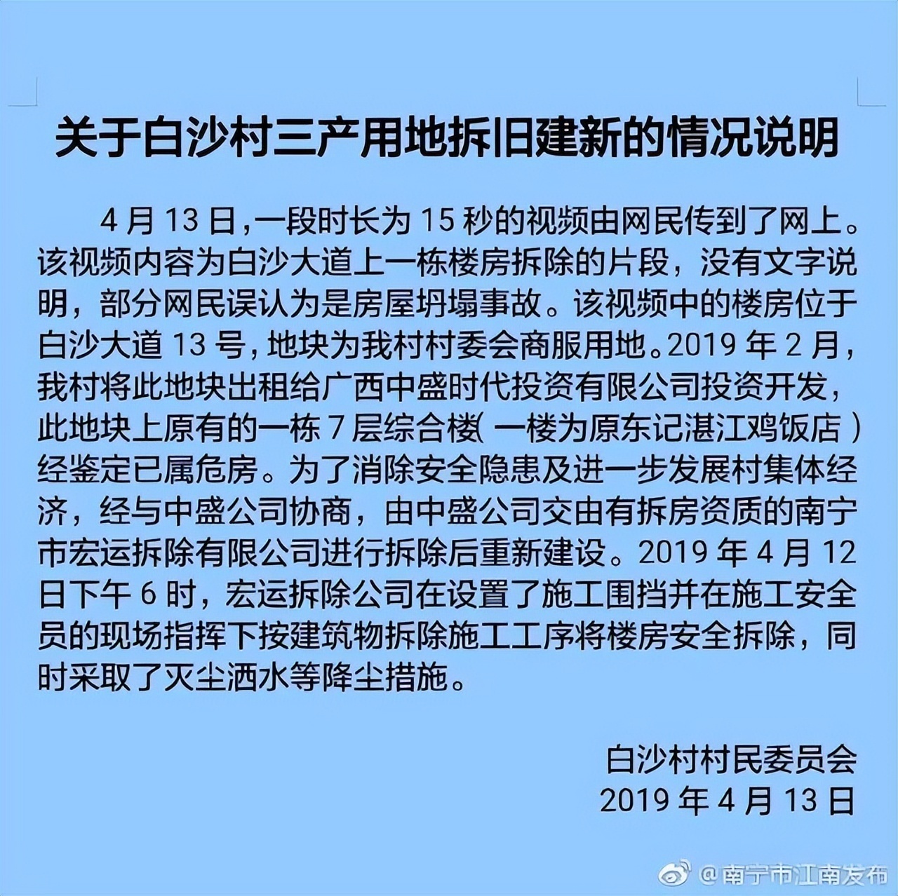 據(jù)悉,該視頻中的樓房位于南寧市白沙大道13號,屬白沙村村委的三產(chǎn)(商業(yè)服務)用地。2019年2月,該地塊被出租給廣西某投資有限公司投資進行開發(fā),在此地塊上原有的一棟7層綜合樓(原為東記湛江雞飯店)已是危房,該公司交給有拆房資質(zhì)的南寧市宏運拆除有限公司進行拆除。