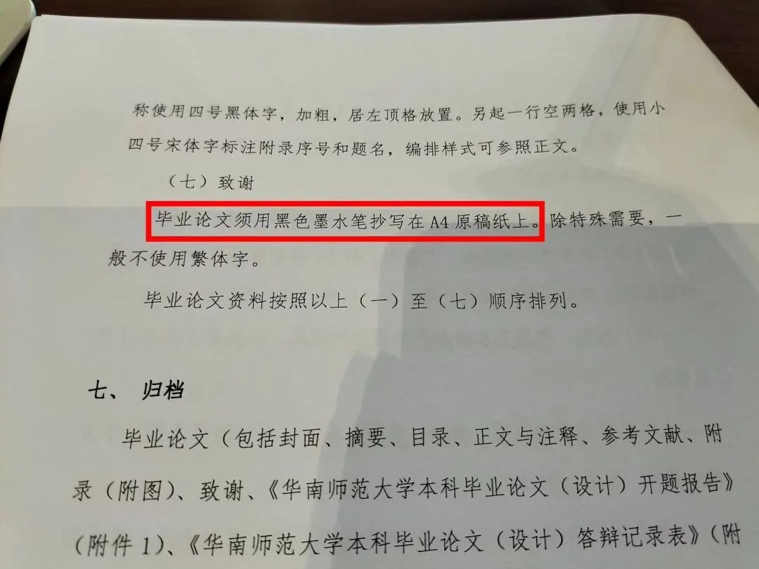 網(wǎng)帖內(nèi)容稱(chēng),華南師大文學(xué)院布置的多達(dá)幾個(gè)文檔的畢業(yè)論文“抄寫(xiě)要求”包括,抄寫(xiě)的特定格式紙張需要學(xué)生自行打印,每頁(yè)400字,起碼需要30+張紙,抄寫(xiě)的筆出水不能太粗等。