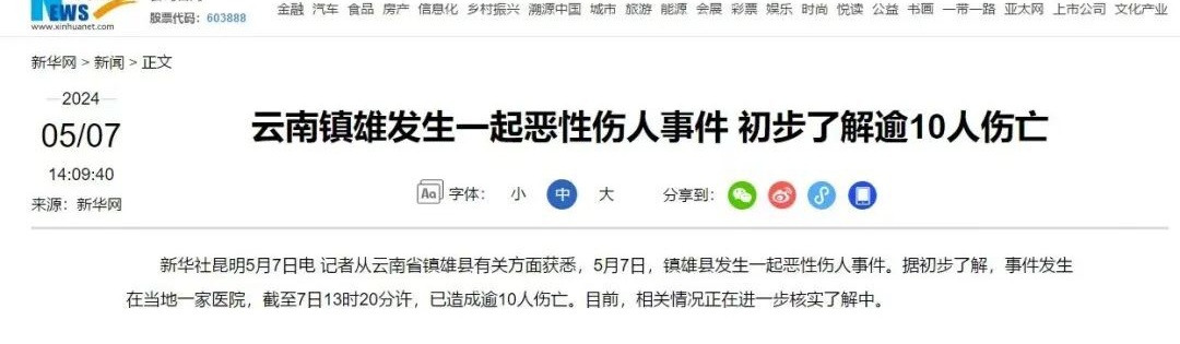 5月7日,記者從權(quán)威信源獲悉,云南昭通鎮(zhèn)雄縣人民醫(yī)院發(fā)生一起持刀傷人案。
