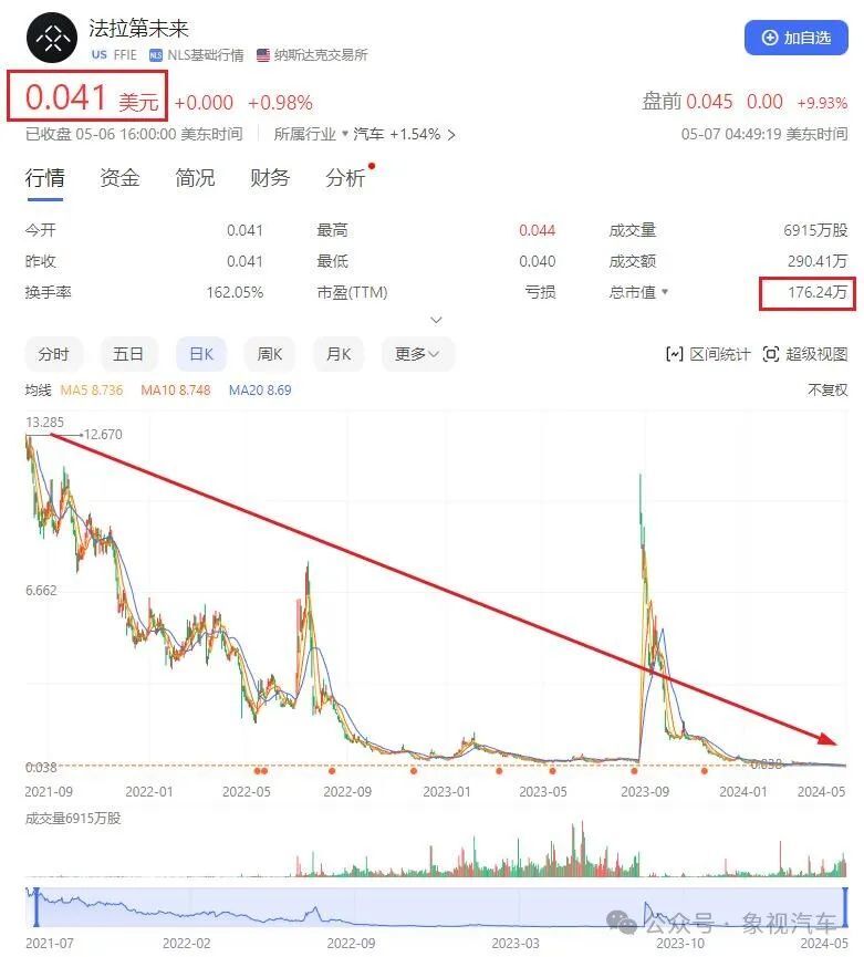 截止5月6日,F(xiàn)F股價(jià)只有0.041美元,市值只剩下可憐176.2萬(wàn)美元,幾乎可以忽略不計(jì)。換而言之,F(xiàn)F的430多億元市值灰飛煙滅。