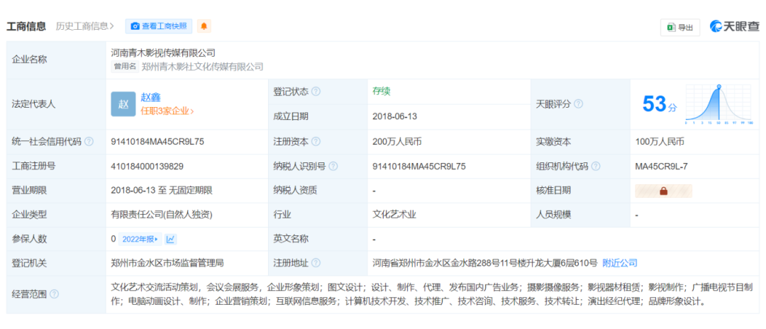 河南青木影視傳媒有限公司成立于2018年6月,注冊資本為200萬。據(jù)河南電視臺消息,5月20日,河南青木影視傳媒有限公司承制河南廣播電視臺都市頻道聯(lián)合攝制的81集都市愛情微短劇《煙火愛情》。