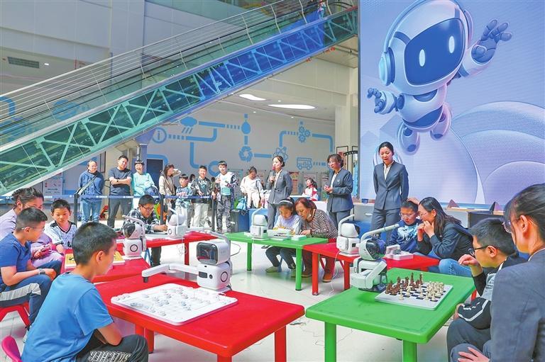 孩子們?cè)诟拭C科技館與機(jī)器人“棋手”對(duì)弈。(記者田蹊)