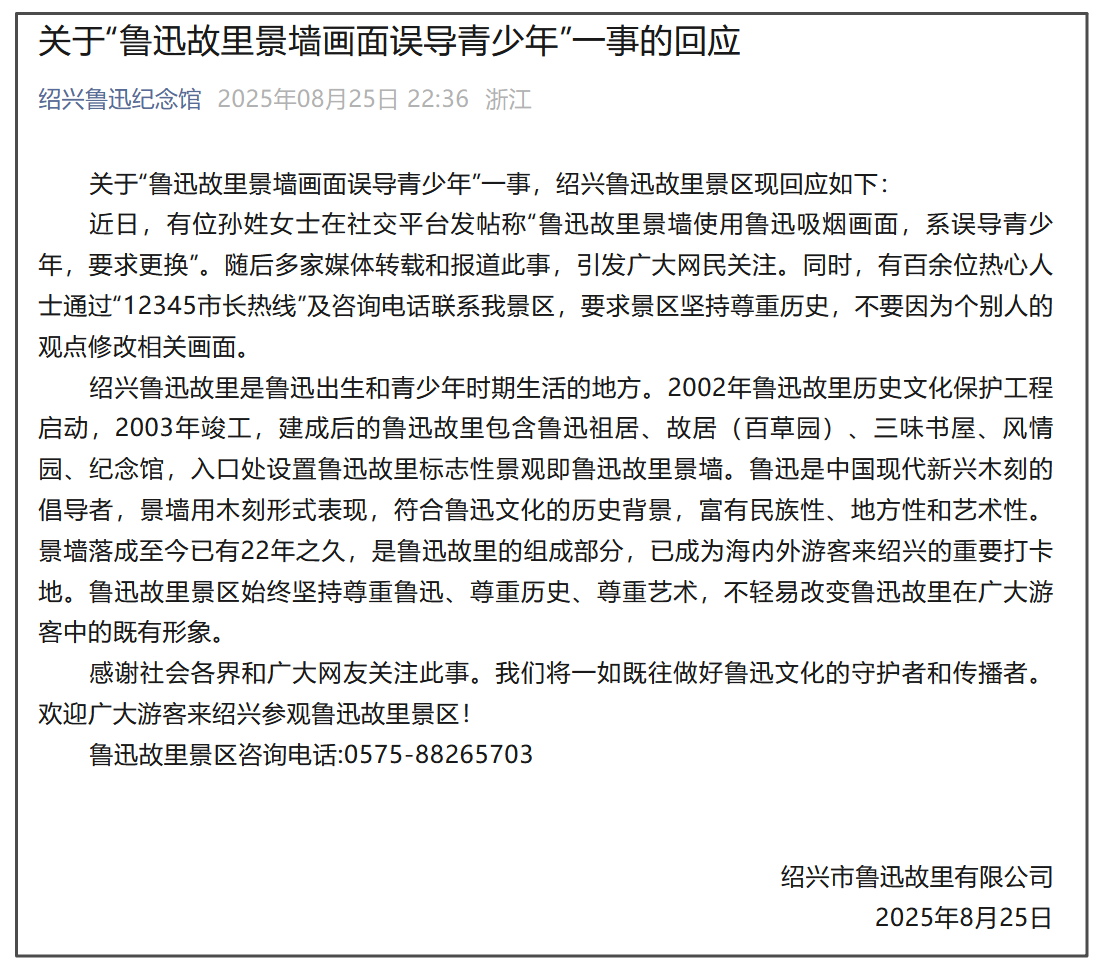 此前,游客孫女士在小紅書發(fā)文稱,8月22日向“浙里辦”投訴,認(rèn)為浙江紹興魯迅紀(jì)念館中的“魯迅抽煙墻”不妥,“誤導(dǎo)青少年,要求更換”。