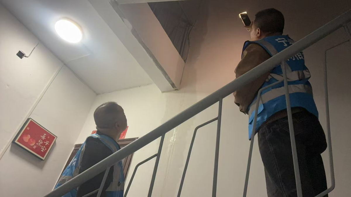 當日上午,郵電小區(qū)居民宋先生反映樓頂出現(xiàn)大面積漏水,積水已沿樓梯墻面蔓延,影響居民生活。接到信息后,東城社區(qū)第一時間組織三名職工趕赴現(xiàn)場。在聯(lián)系樓棟管理人員打開樓門后,工作人員冒雨攀上樓頂排查漏水原因。