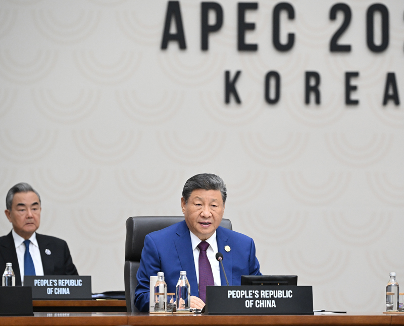 當(dāng)?shù)貢r間11月1日上午,國家主席習(xí)近平在韓國慶州出席亞太經(jīng)合組織第三十二次領(lǐng)導(dǎo)人非正式會議第二階段會議,并發(fā)表題為《共同開創(chuàng)可持續(xù)的美好明天》的重要講話。新華社記者 謝環(huán)馳 攝